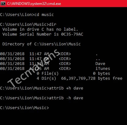 Step 3: Now that the target folder “Dave” has been displayed, issue the following command: “attrib +h dave” and press enter to hide the folder “dave”. By the time you go back to check the Music folder, you will realize that the folder “dave” has been hidden. To make the dave folder visible again, type “attrib -h dave” to unhide the dave folder as shown below: